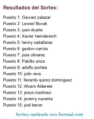 Lista de participantes: Alvaro Alderete, Leonel Bocek, Pablito ariza, jeremy naventa, adolfo portela, gaston carrizo, julio vera, joel beron, llerardo quiroz dominguez, juan duarte, henry vadallares, Giovani zalazar, jose olivarez, jesus martinez, Xavier heindereich.