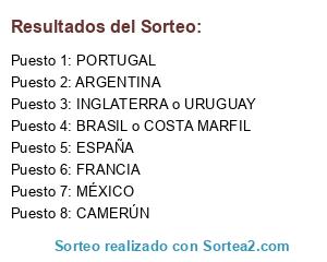 Lista de participantes: ARGENTINA, CAMERÚN, ESPAÑA, FRANCIA, MÉXICO, PORTUGAL, BRASIL o COSTA MARFIL, INGLATERRA o URUGUAY.