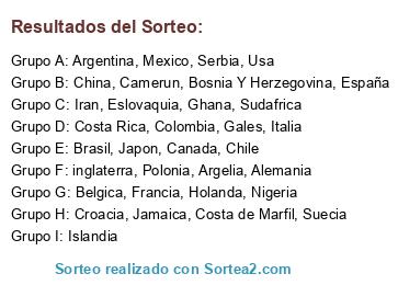 Lista de participantes: Alemania, Argentina, Chile, Brasil, Mexico, Canada, Usa, Jamaica, Italia, inglaterra, Francia, Sudafrica, Costa de Marfil, Ghana, Camerun, China, Iran, Bosnia Y Herzegovina, Japon, Argelia, Gales, Polonia, Nigeria, Holanda, España, Belgica, Croacia, Serbia, Costa Rica, Colombia, Suecia, Islandia, Eslovaquia.