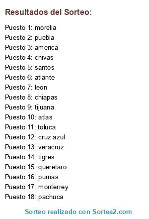 Lista de participantes: cruz azul, toluca, america, pumas, pachuca, queretaro, tijuana, chivas, santos, chiapas, morelia, puebla, monterrey, leon, atlas, atlante, veracruz, tigres.