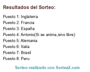 Lista de participantes: Alemania, Brasil, España, Francia, Italia, Peru, Inglaterra, Antonio(Si se anima,sino libre).