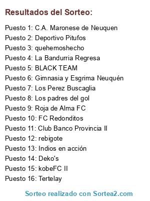 Lista de participantes: FC Redonditos, La Bandurria Regresa, Indios en acción, Deko's, quehemoshecho, Club Banco Provincia II, C.A. Maronese de Neuquen, Tertelay, Roja de Alma FC, kobeFC II, Deportivo Pitufos, Los Perez Buscaglia, Jazz Spectrum f.c, Neuquen Juniors F.C., C.A. 26 de Septiembre, LA ENERGIA SE CONSERVA, C.A. Dragones, Naza Futbol Club, ATL Superpanchos, Neuquén For Export, Club Social y Deportivo Union de Zapala, CLUB UNION FILIAL NEUQUEN, Betta Sport Club, Libre.