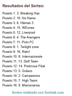 Lista de participantes: Twilight zone, Campesinos, Breaking Hax, The Avengers, Golaco, Héroes 3, High Team, Internazionale, Mercenarios, No Name, Poto FC, Liverpool, Daft Team, Preimous Filial, WEones, Retn!.
