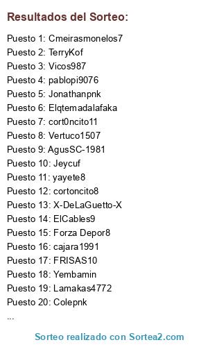 Lista de participantes: FRISAS10, Elqtemadalafaka, Garbanpnk, cajara1991, Forza Depor8, Yembamin, cortoncito8, Jonathanpnk, Vicos987, Fran_TipeR, Colepnk, X-DeLaGuetto-X, Choupapnk, AgusSC-1981, ElCables9, Lamakas4772, pablopi9076, Gebratman, Mario_____Bronx, Cmeirasmonelos7, Robertoo_04, Powerkush22, anxelinho86, TerryKof, RBN1985, MigratoryClown, Vertuco1507, Jeycuf, KawaiiKILLAZn1, cort0ncito11, yayete8, Elkote87.