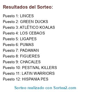 Lista de participantes: LATIN WARRIORS, LIGAPES, LINCES, LIONS KINGS, LOBOS DEL PES, MIS HUEVOS TEAM, PESFRIENDS, PESPASIÓN IBÉRICA, PESSPAIN, UNSERVEK TEAM, WILDBOARDS, HISPANIA PES/FÉNIXPES, GREEN DUCKS/VULCANO, PULPO PAUL/RHINOS DEL PES, CHACALES/PESTIVAL KILLERS, ATLÉTICO KOALAS/MALAKITOS IS SHARKS.