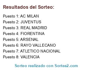 Lista de participantes: ATLETICO NACIONAL, ARSENAL, REAL MADRID, FIORENTINA, JUVENTUS, RAYO VALLECANO, VALENCIA, AC MILAN.