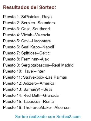 Lista de participantes: Ferminnn--Ajax, Serpico--Sounders, Spiftjose--Celtic, SrPistolas--Rayo, Seal Kapo--Napoli, Havel--Inter, TheForceMaker--Alcorcon, Adizero--America, Tabascos--Roma, Victub--Valencia, Sergiotabascos--Real Madrid, Red Dutti--Granada, Crivi--Llagostera, Samue91--Betis, Saavexbox--Las Palmas, Cruz--Southend.