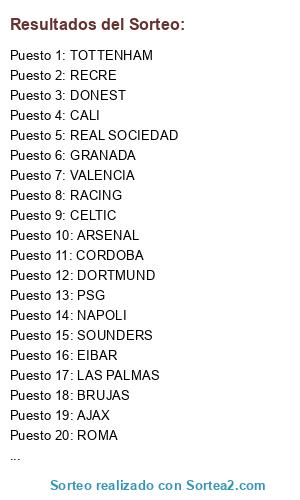Lista de participantes: DONEST, LIVERPOOL, ROMA, VALENCIA, GRANADA, UNITED, SOUNDERS, AJAX, RACING, REAL MADRID, RECRE, SOUTHAMPTON, DEPOR, DORTMUND, REAL SOCIEDAD, EVERTON, CALI, OPORTO, NAPOLI, LAS PALMAS, ALCORCON, BARCELONA, RAYO VALLECANO, BRUJAS, CORDOBA, VILLARREAL, TOTTENHAM, PSG, ARSENAL, CELTIC, ANGELES GALAXY, EIBAR.