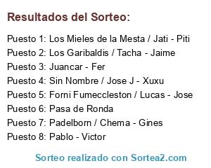 Lista de participantes: Los Garibaldis / Tacha - Jaime, Sin Nombre / Jose J - Xuxu, Forni Fumeccleston / Lucas - Jose, Pablo - Victor, Los Mieles de la Mesta / Jati - Piti, Padelborn / Chema - Gines, Juancar - Fer, Pasa de Ronda.