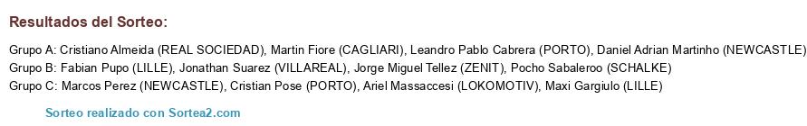 Lista de participantes: Martin Fiore (CAGLIARI), Pocho Sabaleroo (SCHALKE), Jorge Miguel Tellez (ZENIT), Fabian Pupo (LILLE), Maxi Gargiulo (LILLE), Ariel Massaccesi (LOKOMOTIV), Jonathan Suarez (VILLAREAL), Marcos Perez (NEWCASTLE), Cristian Pose (PORTO), Leandro Pablo Cabrera (PORTO), Cristiano Almeida (REAL SOCIEDAD), Daniel Adrian Martinho (NEWCASTLE).