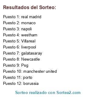 Lista de participantes: Psg, galatasaray, monaco, manchester united, liverpool, Villareal, real madrid, borussia, porto, westham, napoli, Newcastle.
