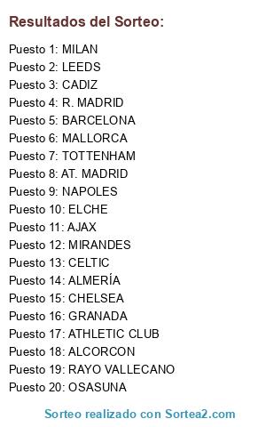 Lista de participantes: OSASUNA, ALMERÍA, CELTIC, BARCELONA, RAYO VALLECANO, R. MADRID, AT. MADRID, ATHLETIC CLUB, CHELSEA, ALCORCON, MIRANDES, ELCHE, MILAN, GRANADA, CADIZ, AJAX, MALLORCA, LEEDS, NAPOLES, TOTTENHAM.