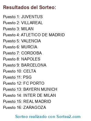 Lista de participantes: CELTA, REAL MADRID, MURCIA, PSG, MILAN, CORDOBA, ATLETICO DE MADRID, BAYERN MUNICH, VILLAREAL, INTER DE MILAN, ZARAGOZA, FC PORTO, JUVENTUS, VALENCIA, NAPOLES, BARCELONA.