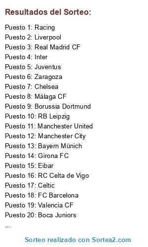 Lista de participantes: Arsenal, Racing, Girona FC, Real Madrid CF, Eibar, Juventus, FC Barcelona, Rayo Vallecano, Chelsea, RB Leipzig, Manchester United, RC Celta de Vigo, PSG, Liverpool, Bayern Münich, Manchester City, Málaga CF, Valencia CF, Levante UD, Boca Juniors, Inter, Celtic, Zaragoza, Borussia Dortmund, Pase directo, Pase directo.