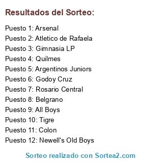 Lista de participantes: All Boys, Argentinos Juniors, Arsenal, Atletico de Rafaela, Belgrano, Colon, Godoy Cruz, Gimnasia LP, Rosario Central, Tigre, Newell's Old Boys, Quilmes.