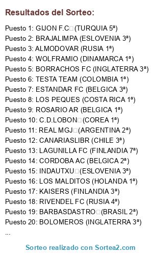 Lista de participantes: ALTZIBAR (ITALIA 2ª), TESTA TEAM (COLOMBIA 1ª), ROSARIO AR (BELGICA 1ª), CAMAROD (ITALIA 4ª), LOS PEQUES (COSTA RICA 1ª), LOS MALDITOS (HOLANDA 1ª), BRAJALIMPA (ESLOVENIA 3ª), CORDOBA AC (BELGICA 2ª), GIJON F.C (TURQUIA 5ª), KAISERS (FINLANDIA 3ª), LAGUNILLA FC (FINLANDIA 7ª), CANARIASLIBR (CHILE 3ª), ROBERMAHONES (DINAMARCA 3ª), VINDEOVER (FINLANDIA 1ª), BORRACHOS FC (INGLATERRA 3ª), BOLOMEROS (INGLATERRA 3ª), RIVENDEL FC (RUSIA 4ª), ROINTE UD (RUSIA 3ª), REAL MGJ (ARGENTINA 2ª), ESTANDAR FC (BELGICA 3ª), WOLFRAMIO (DINAMARCA 1ª), C.D.LOBON (COREA 1ª), INDAUTXU (ESLOVENIA 3ª), BARBASDASTRO (BRASIL 2ª), ALMODOVAR (RUSIA 1ª).