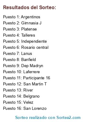 Lista de participantes: Instituto, Argentinos jr, Argentinos de Merlo, Belgrano, Velez, Banfield, Huracan, River, Gimnsia lp, Racing, Talleres, San Lorenzo, San Martín T, All boys, Defensa y justicia, Espera rival.