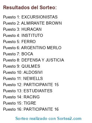 Lista de participantes: Boca, independiente, Lanus, Tigre, Almirante, Quilmes, Gimnasia de Jujuy, Deportivo Madryn, Aldosivi, Estudiantes, Platense, espera rival, Newell´s, Ferro, Rosario Central, chacarita.