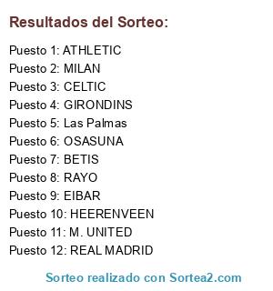 Lista de participantes: Las Palmas, RAYO, CELTIC, OSASUNA, ATHLETIC, EIBAR, HEERENVEEN, M. UNITED, BETIS, REAL MADRID, MILAN, GIRONDINS.