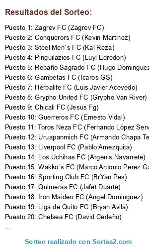 Lista de participantes: Valkrew FC (Haziel Valken Heisenberg), Toros Neza FC (Fernando López Servín), Los Uchihas FC (Argenis Navarrete), Gambetas FC (Icaros GS), Uruapanmich FC (Armando Chapa Tejeda), Steel Men´s FC (Kal Reza), Victoria City FC (Panchoo de la Garzaa), Jabatos FC (Brandon Rdz), Pinguilazios FC (Luyi Edredon), Chelsea FC (David Cedeño), Zagrev FC (Zagrev FC), Wakko´s FC (Marco Antonio Perez Garces), Liverpool FC (Pablo Amezquita), Liga de Quito FC (Bryan Avila), Grypho United FC (Grypho Van River), Guerreros FC (Ernesto Vidal), Chicali FC (Jesus Fg), Sporting Club FC (BrYan Pes), Rebaño Sagrado FC (Hugo Dominguez), Quimeras FC (Jafet Duarte), Herbalife FC (Luis Javier Acevedo), Blacks Lions United FC (Jaime Azahel Juarez Rdz), Iron Maiden FC (Angel Dominguez), Conquerors FC (Kevin Martinez).