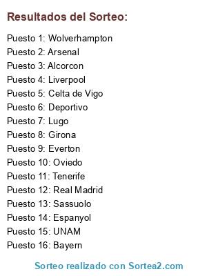Lista de participantes: Deportivo, Sassuolo, Espanyol, Tenerife, Lugo, Alcorcon, Bayern, Liverpool, Celta de Vigo, Everton, Wolverhampton, UNAM, Arsenal, Real Madrid, Girona, Oviedo.