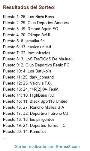 Lista de participantes: 1. Los Chacales del Estoperol, 2. Club Deportivo Fenix FC, 3. LoS TesTiGoS De MaJueL, 4. Los Batuko`s, 5. Kchorro's F.C, 6. C.D. Josefina Antonia, 7. Universidad Catolica de los Rios, 8. jamaika f.c., 9. tumbao, 10. HighBass F.C., 11. Black Sport18 United, 12. Military Academy FC, 13. casixe united, 14. Kameltot, 15. Martin Eckdal, 16. Ingvar Team, 17. k_burgalacticos, 18. los pinigordos, 19. Reload Again FC, 20. Olimpo AzUl, 21. Deportes Torres F.C, 22. Inmunizados, 23. Valdivia F.C., 24. *>R[2]K=- TeaM, 25. dark_comand, 26. Los Bichi Boys, 27. Rancho Mallea S.A, 28. Flow Factory Inc., 29. Club Deportes America, 30. Rivarola F.C., 31. Cizarritos FC, 32. Deportivo Futrono C.F..