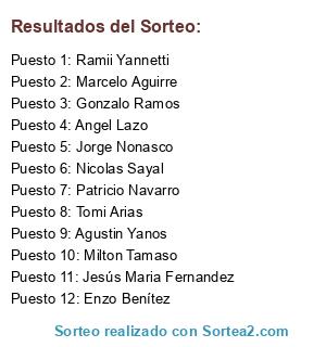 Lista de participantes: Jesús Maria Fernandez, Tomi Arias, Marcelo Aguirre, Ramii Yannetti, Patricio Navarro, Nicolas Sayal, Gonzalo Ramos, Enzo Benítez, Jorge Nonasco, Agustin Yanos, Milton Tamaso, Angel Lazo.
