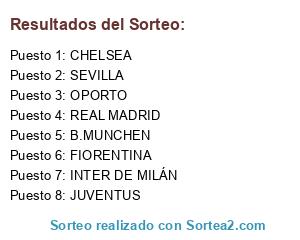 Lista de participantes: REAL MADRID, OPORTO, FIORENTINA, SEVILLA, B.MUNCHEN, CHELSEA, INTER DE MILÁN, JUVENTUS.