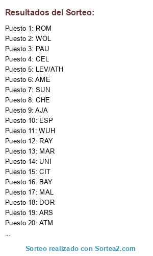 Lista de participantes: LCE, UNI, ARS, ATM, VIG, AJA, BAR, SUN, ESP, RAY, ROM, MAD, CIT, BET, SHE, CEL, CHE, RAN, WAT, WOL, MAL, WUH, PAU, MAR, DOR, AME, BAY, LEV/ATH.
