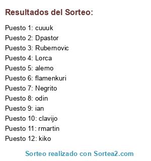 Lista de participantes: Rubernovic, Negrito, Lorca, Dpastor, cuuuk, kiko, rmartin, alemo, odin, ian, clavijo, flamenkuri.