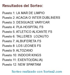 Lista de participantes: PLA-HOSPITAL FS, LOS LEONES FS, DESGUACE VARYCAR, TALLERES LOZAUTO, ALBUFERETA FS, LA MAR DE LIMPIO, ACACIA O INTER DUBLINERS, ATLETICO ALICANTE FS, INDOOR KINGS, ALTOZANO, NEW SPARTAM, EXENTO(IDALIA).