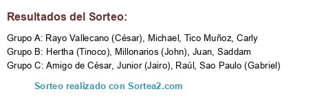Lista de participantes: Junior (Jairo), Millonarios (John), Rayo Vallecano (César), Hertha (Tinoco), Sao Paulo (Gabriel), Raúl, Tico Muñoz, Saddam, Juan, Amigo de César, Michael, Carly.