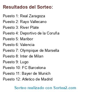 Lista de participantes: Deportivo de la Coruña, Maribor, River Plate, Inter de Milan, Rayo Vallecano, FC Barcelona, Atletico de Madrid, Olympique de Marsella, Bayer de Munich, Real Zaragoza, Lugo, Valencia.