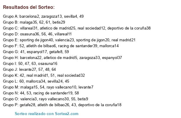 Lista de participantes: real madrid1, barcelona2, valencia3, sevilla4, atletico de madrid5, atletih de bilbao6, levante7, getafe8, betis9, rayo vallecano10, villareal11, real sociedad12, zaragoza13, mallorca14, malaga15, osasuna16, espanyol17, deportivo de la coruña18, racing de santander19, sporting de jigon20, real madrid21, barcelona22, valencia23, sevilla24, atletico de madrid25, atletih de bilbao26, levante27, getafe28, betis29, rayo vallecano30, villareal31, real sociedad32, zaragoza33, mallorca34, malaga35, osasuna36, espanyol37, deportivo de la coruña38, racing de santander39, sporting de jigon40, 41, 42, 43, 44, 45, 46, 47, 48, 49, 50, 51, 52, 53, 54, 55, 56, 57, 58, 59, 60, 61, 62, 63, 64.