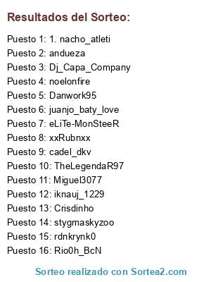 Lista de participantes: 1. nacho_atleti, juanjo_baty_love, andueza, Danwork95, stygmaskyzoo, Rio0h_BcN, cadel_dkv, rdnkrynk0, Crisdinho, eLiTe-MonSteeR, Dj_Capa_Company, TheLegendaR97, noelonfire, iknauj_1229, xxRubnxx, Miguel3077.