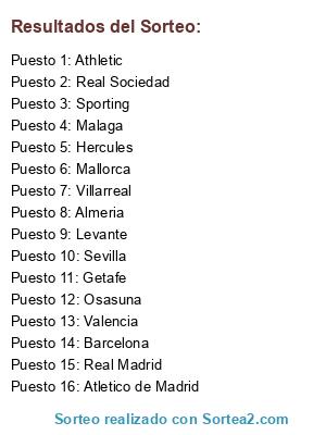Lista de participantes: Valencia, Malaga, Real Sociedad, Real Madrid, Osasuna, Almeria, Hercules, Getafe, Athletic, Mallorca, Levante, Villarreal, Atletico de Madrid, Sevilla, Sporting, Barcelona.