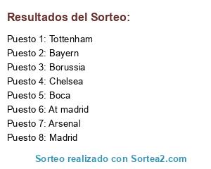 Lista de participantes: Arsenal, Borussia, Chelsea, Tottenham, Boca, Madrid, Bayern, At madrid.