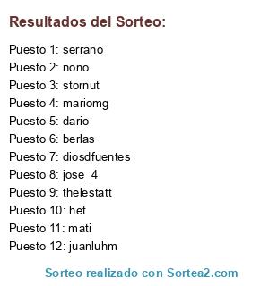 Lista de participantes: het, juanluhm, stornut, thelestatt, diosdfuentes, mariomg, jose_4, daniel, dario, serrano, berlas, nono, mati.