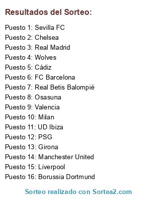 Lista de participantes: Chelsea, Liverpool, Cádiz, Osasuna, Valencia, Milan, Real Betis Balompié, PSG, Wolves, Borussia Dortmund, Manchester United, UD Ibiza, Girona, Real Madrid, FC Barcelona, Sevilla FC.