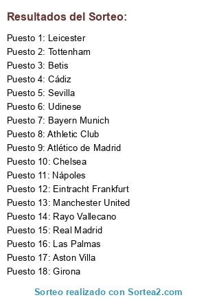 Lista de participantes: Atlético de Madrid, Athletic Club, Las Palmas, Tottenham, Nápoles, Manchester United, Betis, Girona, Cádiz, Real Madrid, Sevilla, Bayern Munich, Rayo Vallecano, Udinese, Aston Villa, Chelsea, Eintracht Frankfurt, Leicester.