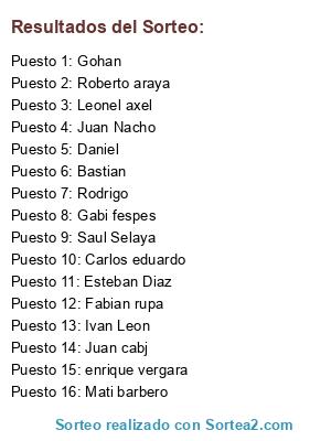 Lista de participantes: Ivan Leon, Esteban Diaz, Juan Nacho, Bastian, Roberto araya, Daniel, Rodrigo, Gabi fespes, Mati barbero, Saul Selaya, Gohan, Fabian rupa, Leonel axel, Carlos eduardo, Juan cabj, enrique vergara.
