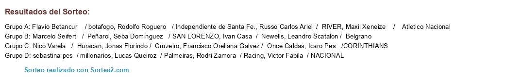 Lista de participantes: Lucas Queiroz / Palmeiras, Victor Fabila / NACIONAL, Flavio Betancur / botafogo, Ivan Casa / Newells, Nico Varela / Huracan, Russo Carlos Ariel / RIVER, Jonas Florindo / Cruzeiro, Marcelo Seifert / Peñarol, Francisco Orellana Galvez / Once Caldas, Icaro Pes /CORINTHIANS, Rodri Zamora / Racing, sebastina pes / millonarios, Leandro Scatalon / Belgrano, Seba Dominguez / SAN LORENZO, Maxii Xeneize / Atletico Nacional, Rodolfo Roguero / Independiente de Santa Fe..