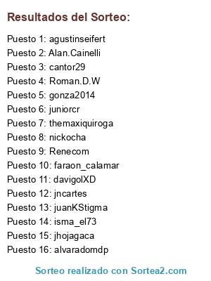 Lista de participantes: francisco.cabj, tjansem, SFREUN, vitorsfc, kurilin, sebarugbyer, fitofarais, Blitz, arku, mou27, pasquenze, R4M4FULL, javibarqui, jack_torrance, Damiansan, mati-gti89.