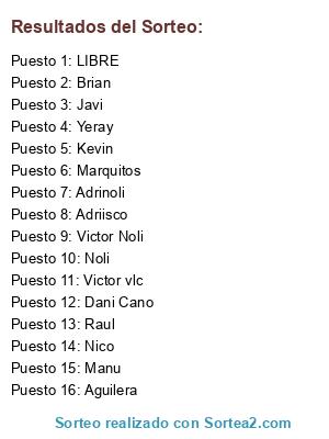 Lista de participantes: Aguilera, Marquitos, Brian, Kevin, Adriisco, Dani Cano, Javi, Adrinoli, Manu, Nico, Noli, Raul, Victor Noli, Victor vlc, Yeray, LIBRE.