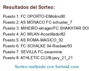 Lista de participantes: AS MÓNACO FC-schuster_7, FC OPORTO-ElMolino90, ATHLETIC CLUB-javy_21_21, AC MILAN-Acostillador82, AS ROMA-MAGICO_92, SEVILLA FC-zeusminie, FC SCHALKE 04-Roobeer93, MINEIRO-elnager/FC SHAKHTAR DONETSK-Djgarry.