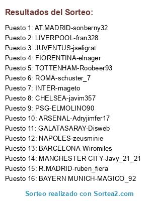 Lista de participantes: PSG-ELMOLINO90, CHELSEA-javim357, MANCHESTER CITY-Javy_21_21, R.MADRID-ruben_fiera, INTER-mageto, BARCELONA-Wiromiles, ROMA-schuster_7, TOTTENHAM-Roobeer93, LIVERPOOL-fran328, FIORENTINA-elnager, BAYERN MUNICH-MAGICO_92, GALATASARAY-Disweb, JUVENTUS-jseligrat, AT.MADRID-sonberny32, ARSENAL-Adryjimfer17, NAPOLES-zeusminie.