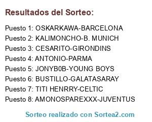 Lista de participantes: AMONOSPAREXXX-JUVENTUS, ANTONIO-PARMA, OSKARKAWA-BARCELONA, TITI HENRRY-CELTIC, BUSTILLO-GALATASARAY, KALIMONCHO-B. MUNICH, JONYB0B-YOUNG BOYS, CESARITO-GIRONDINS.