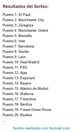 Lista de participantes: Real Madrid, Ajax, Colonia, BvB, Benfica, Inter, Newells, Roma, Lazio, Atlanta, Mallorca, Bayern, Basilea, Zaragoza, Barcelona, Espanyol, Real Betis, Forest Green Rover, Milan, Manchester United, Las Palmas, Sevilla, Marsella, St Pauli, PSG, Atletico de Madrid, Manchester City, Liverpool, Fiorentina, Lyon.