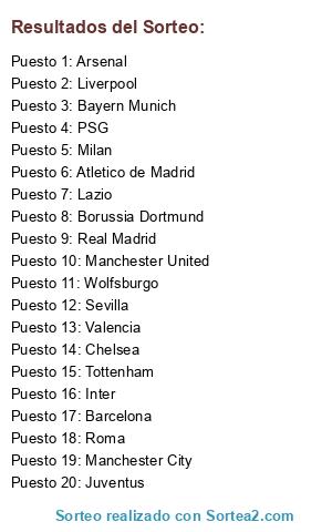 Lista de participantes: Barcelona, Juventus, Manchester United, Manchester City, Borussia Dortmund, Tottenham, Sevilla, Wolfsburgo, Inter, Lazio, Real Madrid, PSG, Bayern Munich, Valencia, Chelsea, Atletico de Madrid, Roma, Liverpool, Milan, Arsenal.