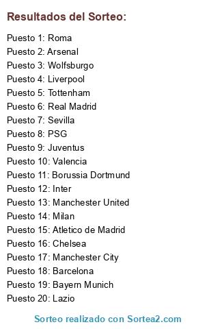 Lista de participantes: Barcelona, Juventus, Manchester United, Manchester City, Borussia Dortmund, Tottenham, Sevilla, Wolfsburgo, Inter, Lazio, Real Madrid, PSG, Bayern Munich, Valencia, Chelsea, Atletico de Madrid, Roma, Liverpool, Milan, Arsenal.